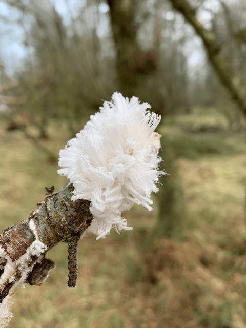 Volunteers have been working enthusiastically at both Leadburn Community Woodland and one of its satellites at Whim, where this great photo of ‘hair ice’ was taken.
